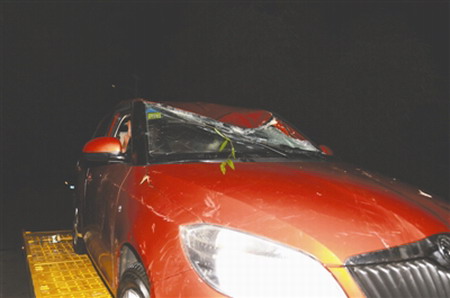 小车被打捞上岸,车身前部、顶部受损,后保险杠脱落